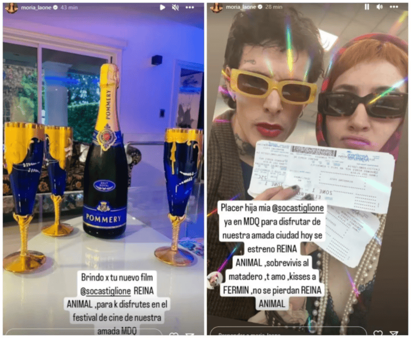 Por otro lado, su mamá Moria se manifestó en las redes sociales. “Brindo por tu nuevo film, Reina Animal, para que disfrutes en el Festival de Cine de nuestra amada MDQ (Mar del Plata)”. Luego, sobre otra imagen en la que se podía apreciar que la actriz ya había arribado a la ciudad costera, escribió: “Placer hija mía. Ya en MDQ para disfrutar de nuestra amada ciudad. Hoy se estrenó Reina Animal, sobrevivís al matadero. Te amo. Besos a Fermín. No se pierdan Reina Animal”.